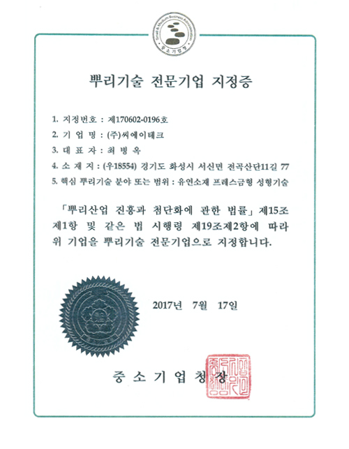 | 2017. 07 | 뿌리기술 전문 기업 지정 (중소기업청) | |
