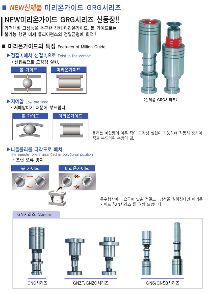미리온가이드 개요 미리온가이드 제품의 형식 미리온가이드 취부방법 미리온가이드 사용예·효과 미리온가이드 강성휨 비교데이터 미리온가이드 GNG시리즈 금형용 미리온가이드 FBG/FBGW시리즈 미리온가이드 GNZF/GNZC시리즈 미리온가이드 GNS/GNSB시리즈 신제품 미리온가이드 GRG시리즈 샤프트가이드 개요 샤프트가이드 기본정격하중·사용예 샤프트가이드 (다가면 타입)GBTT 샤프트가이드 (원형축 타입)GBTM 미리온 그리스