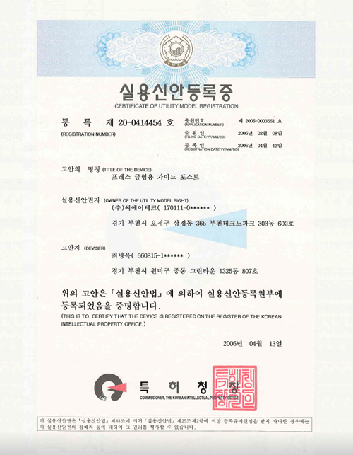 | 2006 | 2006. 04 | Utility model registration and press mold guide post |