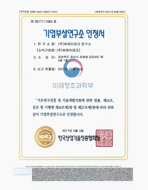 | 2017. 04 | 기업 부설 연구소 설립 (한국산업기술진흥협회) | |